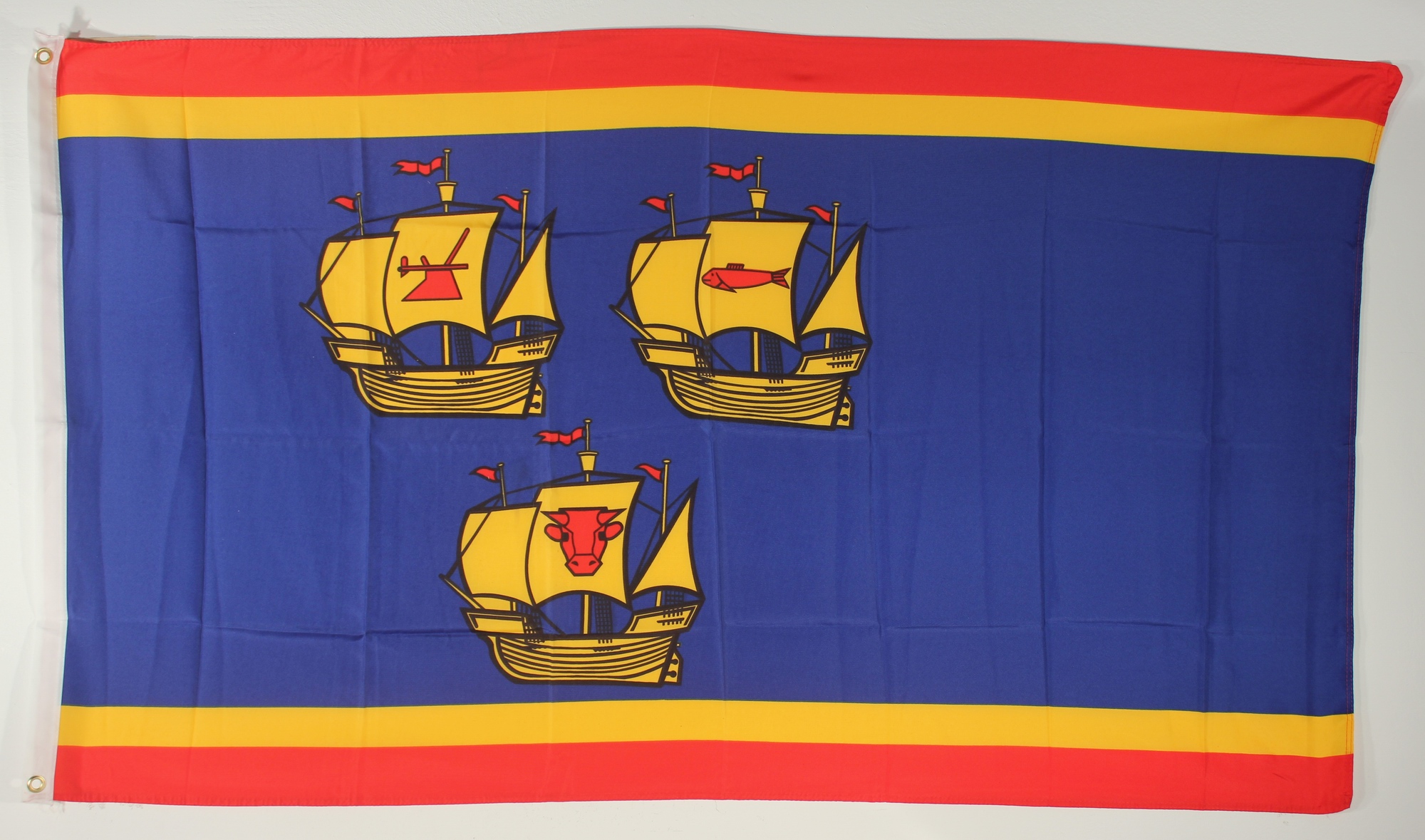 Die Flagge ist aus hochwertigem Polyesterstoff beidseitig lichtecht bedruckt und damit für Innen und Aussen geeignet. Die Fahne ist 2-fach umnäht. Im Besatzband sind zwei stabile messingfarbene Metallösen zur Befestigung am Flaggenmast eingearbeitet.