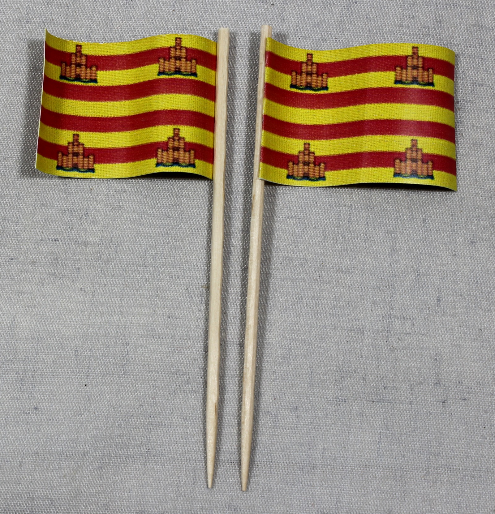 Unsere Party Picker Fahnen (25x36 mm, Schweizer Kantone 25x25 mm) sind nicht wie allgemein üblich lieblos um den Zahnstocher herumgeklebt sondern werden zunächst von Hand mittig gefaltet und verklebt, danach gewölbt und stumpf gegen den nur einseitig unten gespitzten 80 mm Zahnstocher geleimt. Bei asymetrischen Motiven ist die Rückseite der Pickerflagge gespiegelt gedruckt, ausser natürlich Flaggen mit Text-Bestandteilen. Dadurch sieht die Flagge wie echt am Fahnenmast wehend aus. Sie kaufen also absolute Profi-Qualität die ihresgleichen sucht!
