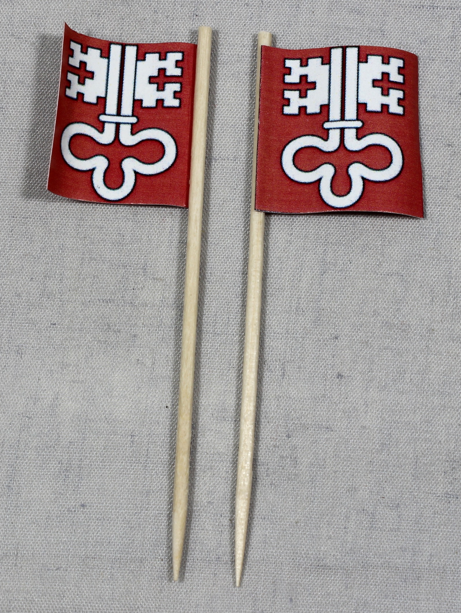 Unsere Party Picker Fahnen (25x36 mm, Schweizer Kantone 25x25 mm) sind nicht wie allgemein üblich lieblos um den Zahnstocher herumgeklebt sondern werden zunächst von Hand mittig gefaltet und verklebt, danach gewölbt und stumpf gegen den nur einseitig unten gespitzten 80 mm Zahnstocher geleimt. Bei asymetrischen Motiven ist die Rückseite der Pickerflagge gespiegelt gedruckt, ausser natürlich Flaggen mit Text-Bestandteilen. Dadurch sieht die Flagge wie echt am Fahnenmast wehend aus. Sie kaufen also absolute Profi-Qualität die ihresgleichen sucht!