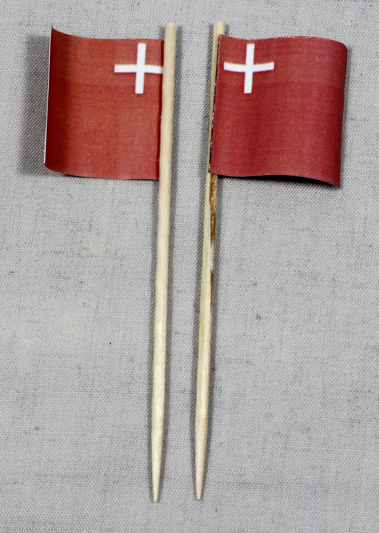 Unsere Party Picker Fahnen (25x36 mm, Schweizer Kantone 25x25 mm) sind nicht wie allgemein üblich lieblos um den Zahnstocher herumgeklebt sondern werden zunächst von Hand mittig gefaltet und verklebt, danach gewölbt und stumpf gegen den nur einseitig unten gespitzten 80 mm Zahnstocher geleimt. Bei asymetrischen Motiven ist die Rückseite der Pickerflagge gespiegelt gedruckt, ausser natürlich Flaggen mit Text-Bestandteilen. Dadurch sieht die Flagge wie echt am Fahnenmast wehend aus. Sie kaufen also absolute Profi-Qualität die ihresgleichen sucht!