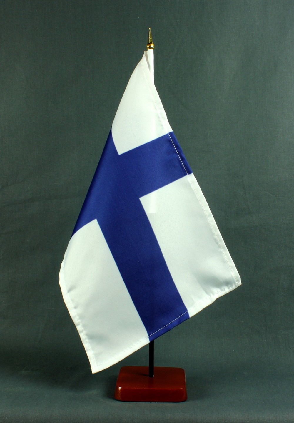 Produktinformationen "Tischflagge Finnland 20x30 cm optional mit Tischflaggenständer aus Mahagoni Holz"