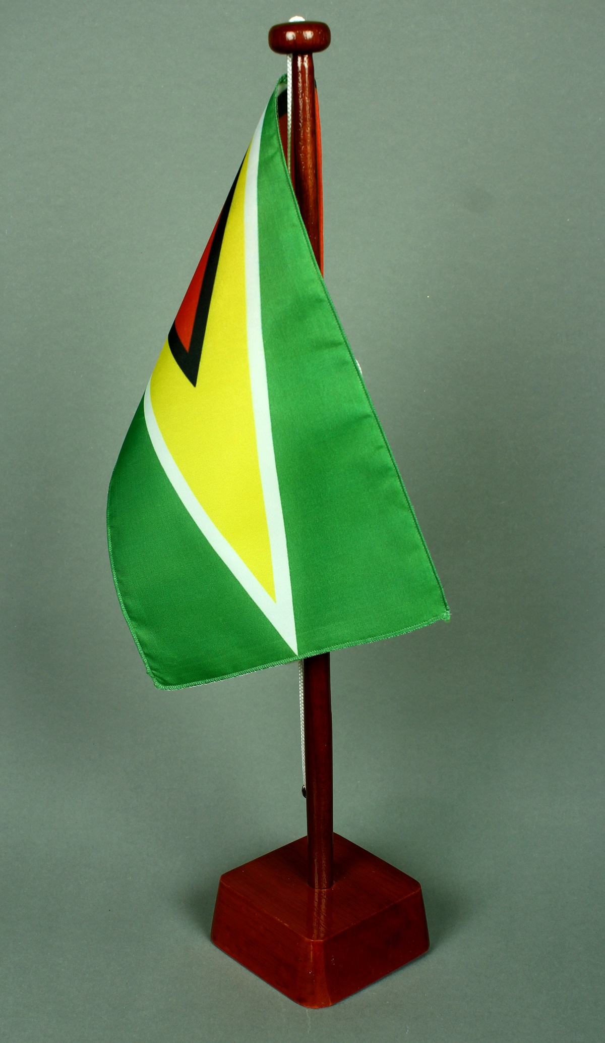 Mahagoni-Ständer: in Handarbeit mehrfach grundiert, geschliffen und lackiert. Der Fahnenmast ist leicht konisch gedrechselt und wird in das eckige Unterteil (ca. 8,5 x 8,5 x 3,5 cm) gesteckt.