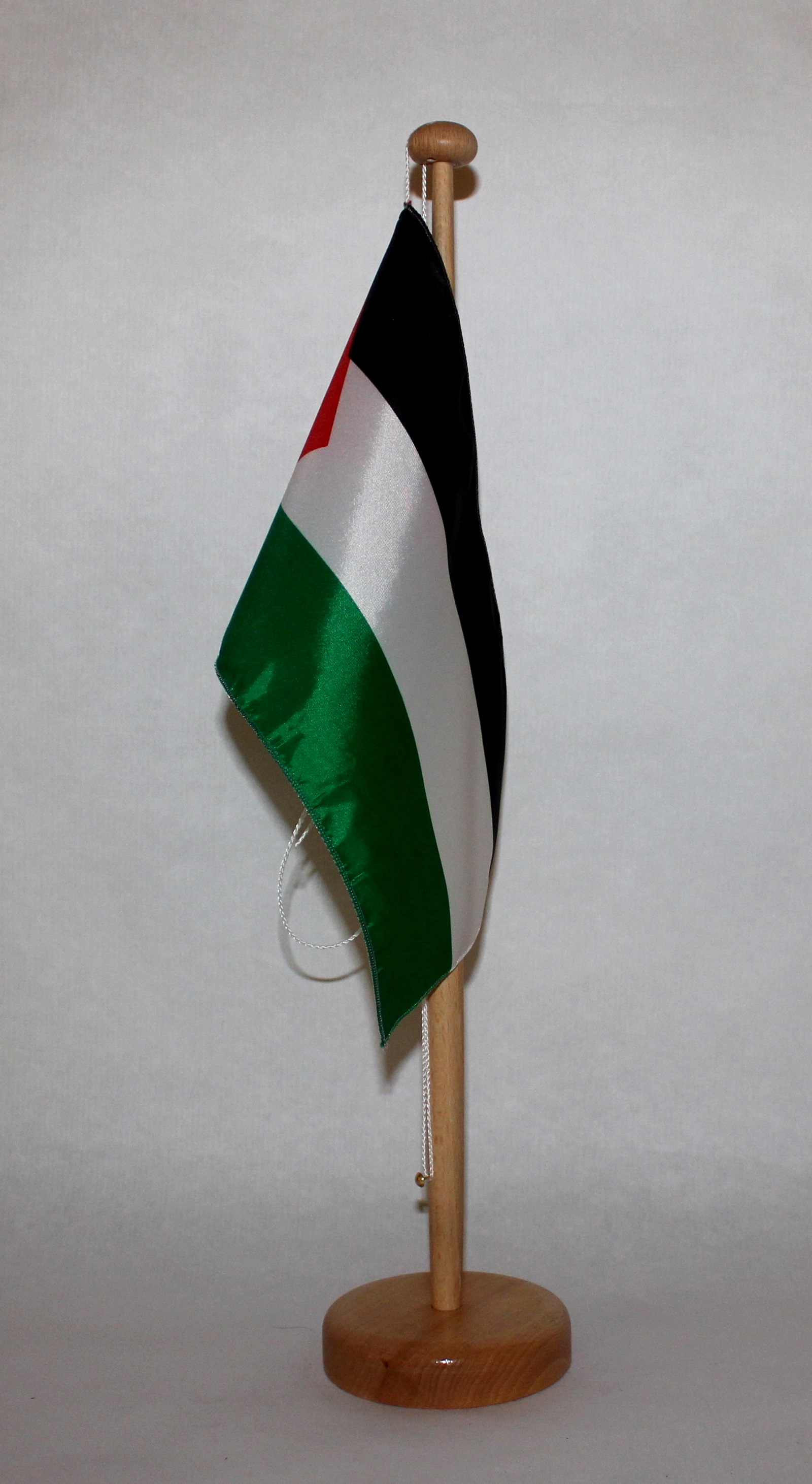 Bei allen Tischflaggenständer ist der Mastkopf mit zwei Bohrungen zur Aufnahme der Flaggenleine versehen. Im unteren Bereich des Flasggenmastes befindet sich ein Metallnagel zur Befestigung der Kordel.