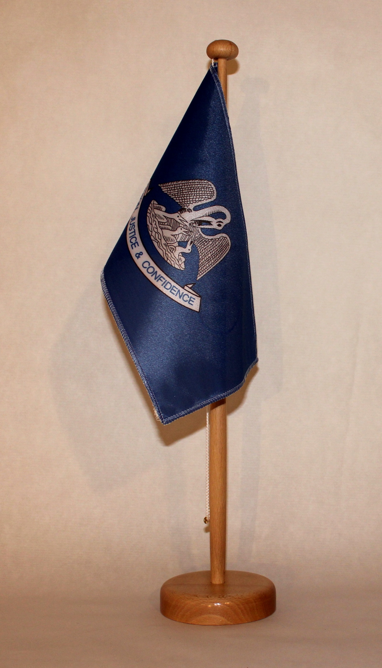 Sie können die Tischfahne mit oder ohne Ständer, oder nur den Ständer bestellen. Der Ständer ist aus lackiertem Massivholz, Höhe 42 cm und hat im Kopf 2 Bohrlöcher für die Flaggenleine sowie im unteren Bereich eine Metallöse. Der Flaggenmast wird in das runde Unterteil eingesteckt.