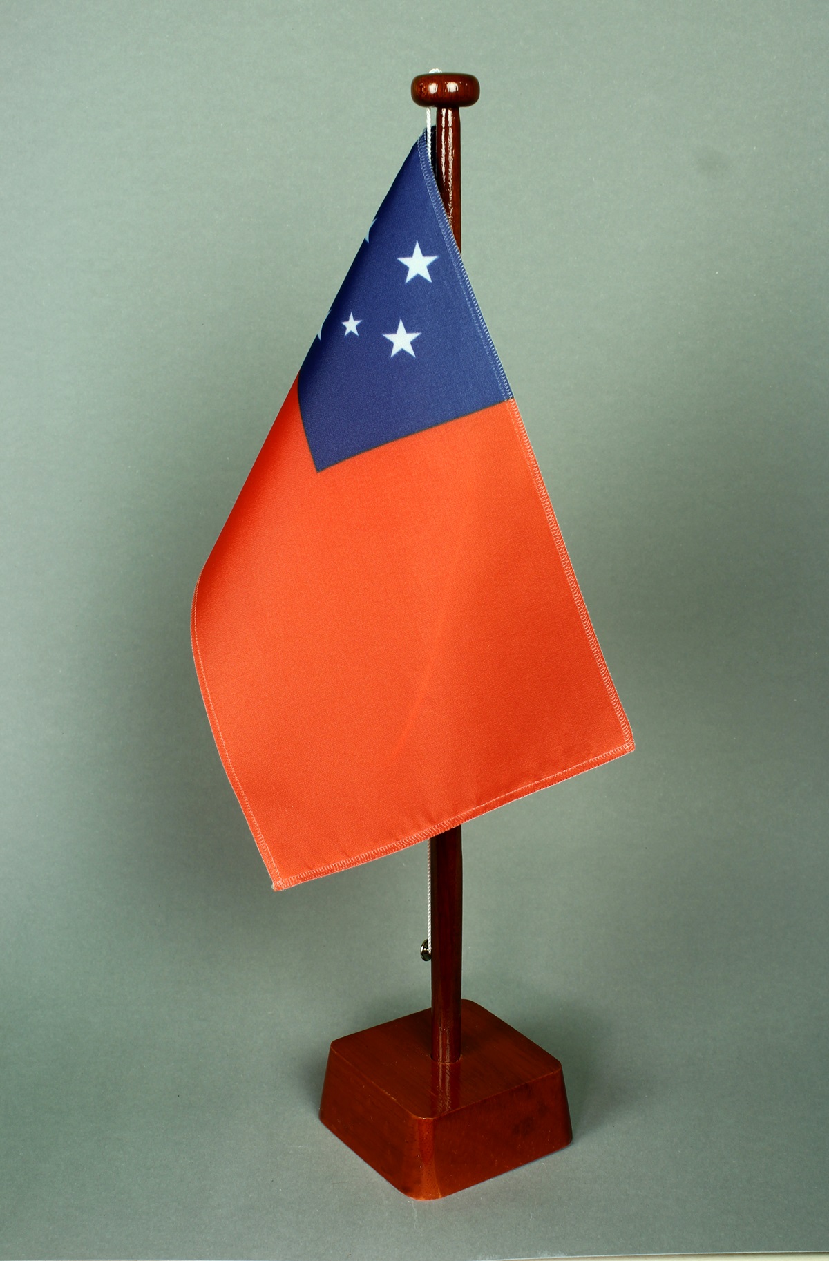 Mahagoni-Ständer: in Handarbeit mehrfach grundiert, geschliffen und lackiert. Der Fahnenmast ist leicht konisch gedrechselt und wird in das eckige Unterteil (ca. 8,5 x 8,5 x 3,5 cm) gesteckt.